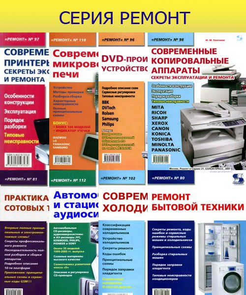 "Ремонт" - это серия (160 книг) предназначенная для специалистов и подготовленных пользователей, обслуживающих бытовую и оргтехнику. Все, что вы хотели узнать о ремонте простой и сложной бытовой электронной техники и промышленной аппаратуры. Нужные схемы и описания принципов работы, методики поиска и устранения неисправностей. Книги, альбомы и справочники по ремонтной тематике для всех.